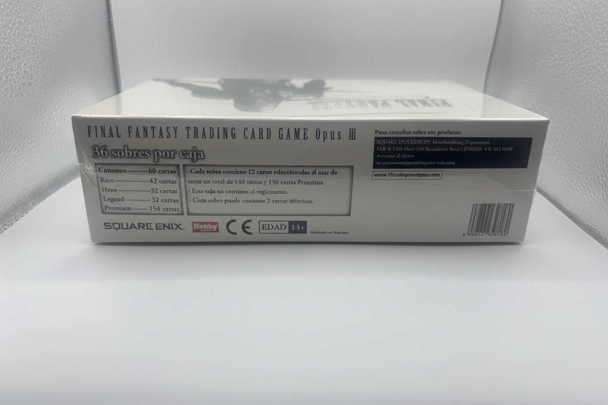 The Final Fantasy Trading Card Game Opus III - Edición Español - Booster Set is a collectable card game product manufactured by Square Enix. This box set contains cards from the Final Fantasy TCG series, specifically from the Opus III set. Each set includes booster packs made of paperboard, featuring cards for players to collect and use in their gameplay sessions. This particular edition is in Spanish, making it accessible to Spanish-speaking players who enjoy the Final Fantasy TCG